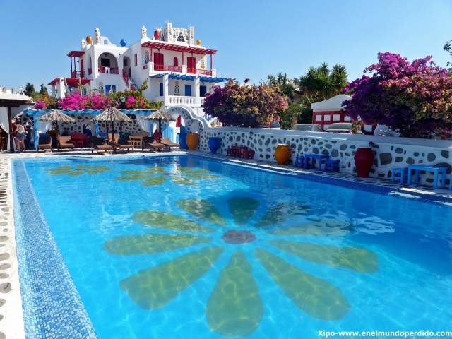 Pero no solo por el ahorro de dinero decidimos coger el Sun of Mykonos. Su coqueto estilo, su sorprendente decoración, el hecho de que sean habitaciones-estudio con una pequeña cocina integrada o la gran piscina que tiene el hotel fueron otros hechos determinantes en nuestra elección. Y sin duda que acertamos.
