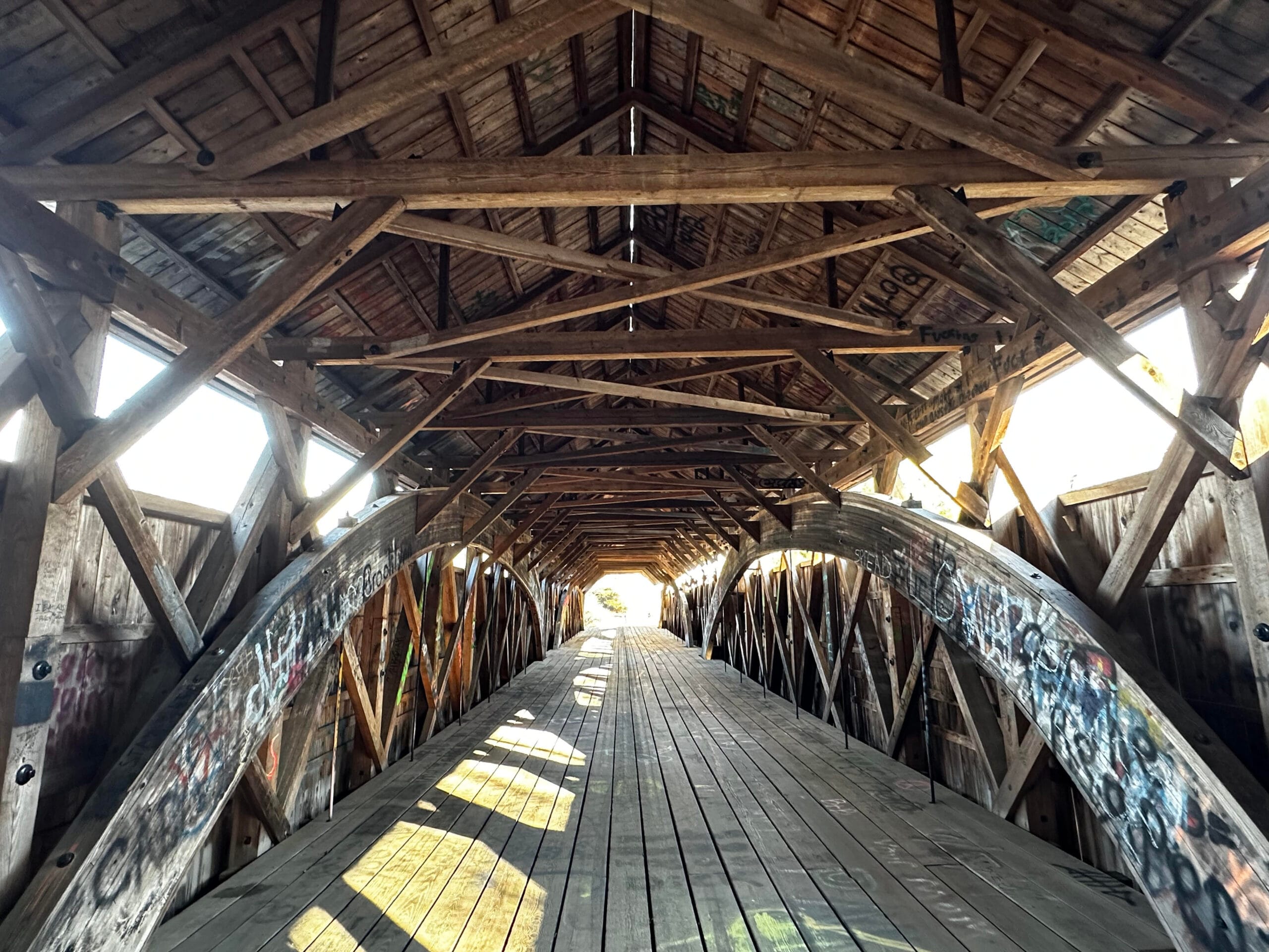 Es un puente de 33 metros hecho de madera sobre unos estribos de granito. Fue nombrado además, Monumento Histórico de Ingeniería Civil de Maine por la Sociedad Americana de Ingenieros Civiles. Merece la pena atravesar caminando elpuente para contemplar los arcos de madera de su tejado.