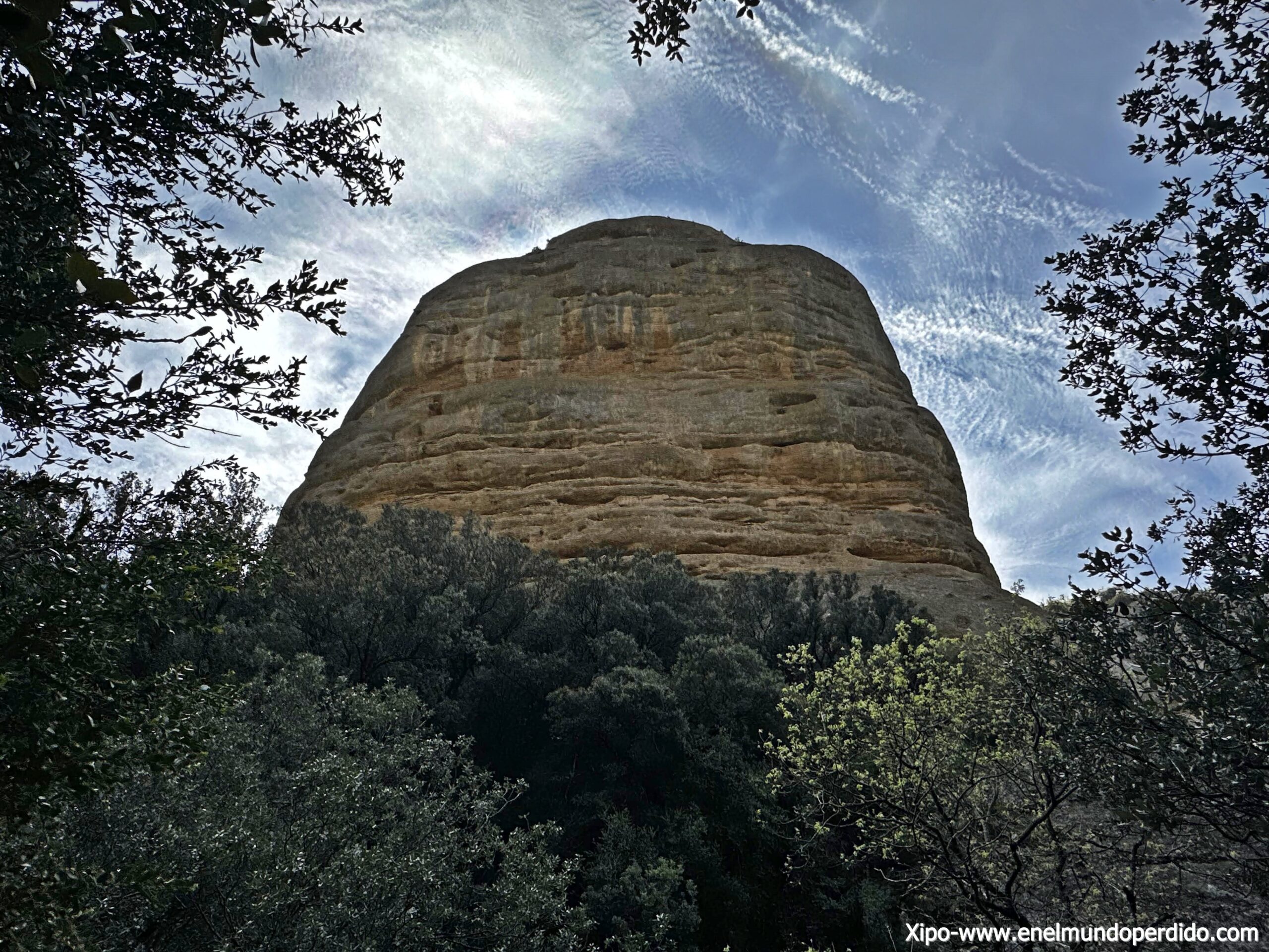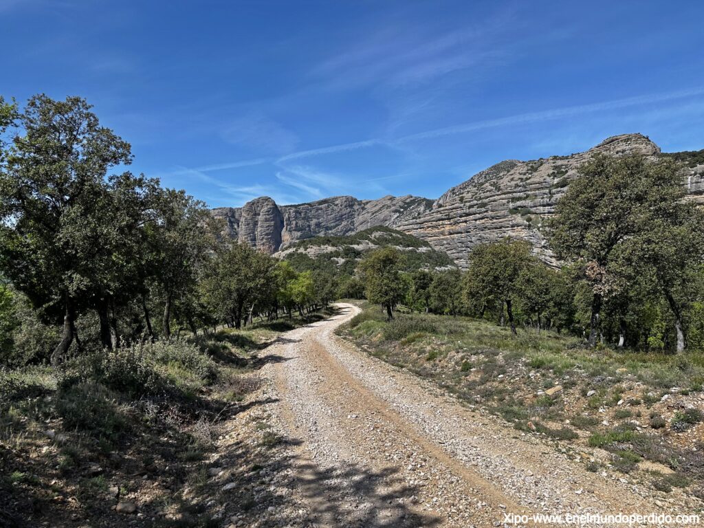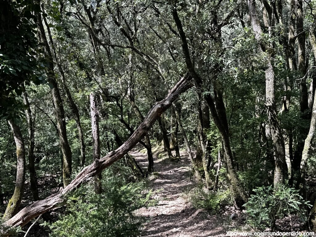Otro de los puntos importantes de esta ruta es el añadido hasta el Huevo de San Cosme. En la misma pista de tierra veréis el desvio para subir hacia él. No os preocupeis, pues el sendero de acceso está marcado con un cartel. Desde el momento que veaís el cartel son tan solo 1300 metros hasta el huevo de San Cosme. Aunque al principio es un camino de subida, a los pocos metros pierde la pendiente y pasa a ser prácticamente plano. De hecho antes de llegar al Huevo de San Cosme incluso nos hace atravesar un bosque de carrascas, lleno de sombras y con temperaturas muy agradables.