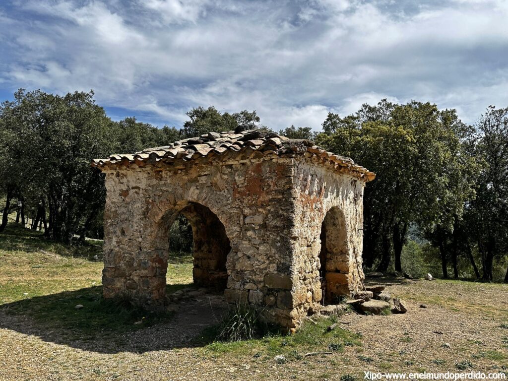 Finalmente el sendero nos lleva hasta la última parada de la ruta. Se trata de Cruz Cubierta o Caseta de los Cuatro Vientos. Se trata de un exconjunradero. Esto es, un lugar mágico para ahuyentar tormentas y granizo. Esta caseta está muy próxima a la pista de tierra que habíamos recorrido a la ida ( nosotros decidimos dejar su visita para el final de la etapa) y es el punto de salida a la pista de tierra en el tramo recorrido de vuelta.
