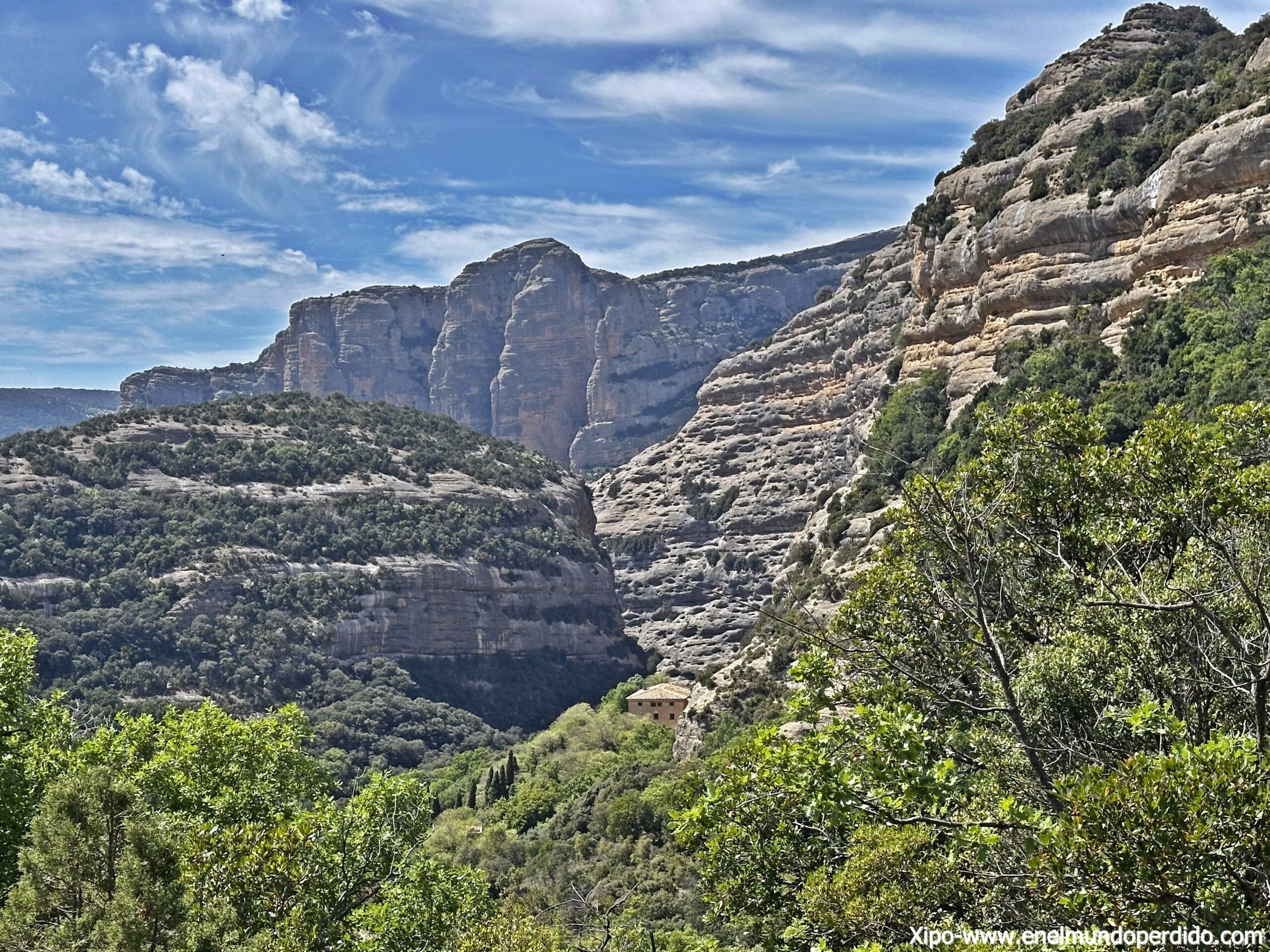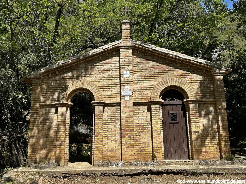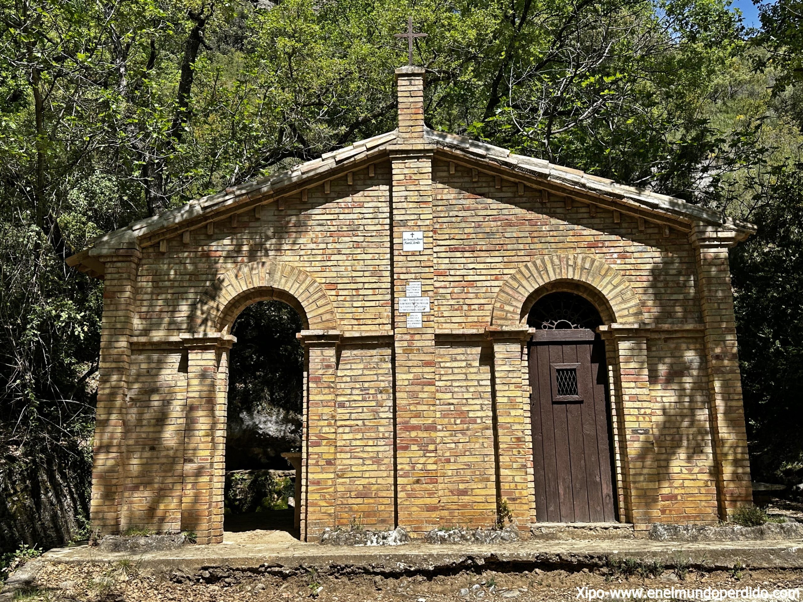 Más adelante se encuentra el Santuario de San Cosme y San Damián. Se trata de un santuario ruprestre levantado en un entorno de rocas típicas de esta zona de Guara. No siempre está abierto, por lo que es posible que os lo encontréis cerrado al público y con algunas cabras montesas deambulando por sus alrededores.